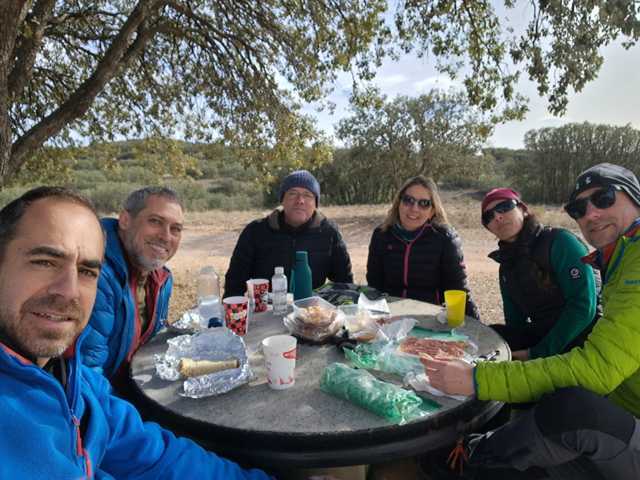 Felicitaciones y fotos individuales y de grupo, y visita al pilón de la Sierra Palomera, a 1533 metros de altura, desde donde en un día despejado como el que teníamos, se puede contemplar el valle del Jiloca, la Sierra Minera, Montes Universales, Sierra de Albarracín y Sierra de Javalambre. Bajamos durante 45 minutos por un camino bien señalizado por marcas rojas y mojones, y con algún tramo equipado con línea de vida por si se quiere ir más tranquilo. Y al llegar a los coches, descargamos material y movemos un kilómetro hasta el Albergue Refugio de Palomera, de propiedad municipal, donde damos buena cuenta de nuestras provisiones entre agradables conversaciones, anecdotarios varios y planes y promesas para siguientes actividades de As Cimas.