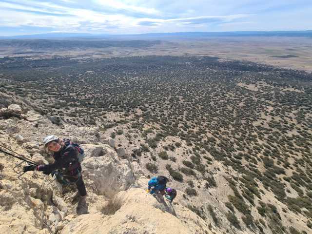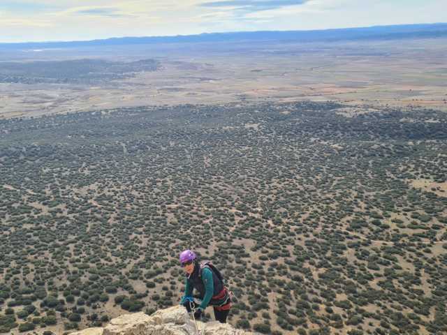 La progresión continúa siguiendo las grapas y algún que otro tramo (pocos) con agarres en roca, que colabora en hacer algo más divertida la subida. El viento no es peligroso, pero sí molesta, y algún buitre lo aprovecha para acercarse a curiosear lo que hacemos. Un par de desplomes bastante suaves y una travesía de escasos 10 metros terminan de definir esta K2 fácil y asequible para debutantes y niños, y con unas fantásticas vistas tanto en la subida como ya en el final, al que llegamos en poco menos de una hora.