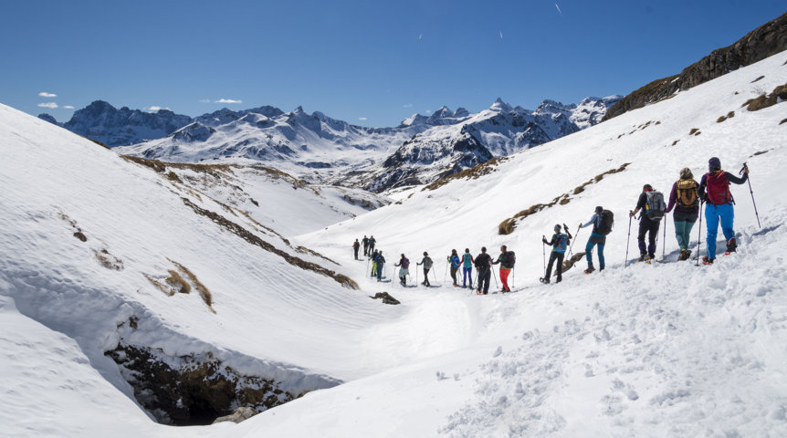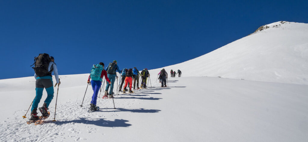 La actividad era al Pico Baldetosas desde la frontera del Portalet, un recorrido bastante sencillo en los primeros cuatro kilómetros, recorriendo la ladera sur del Baldetosas en los que tuvimos que portear las raquetas en la mochila, ante la escasez y estado de la nieve.
